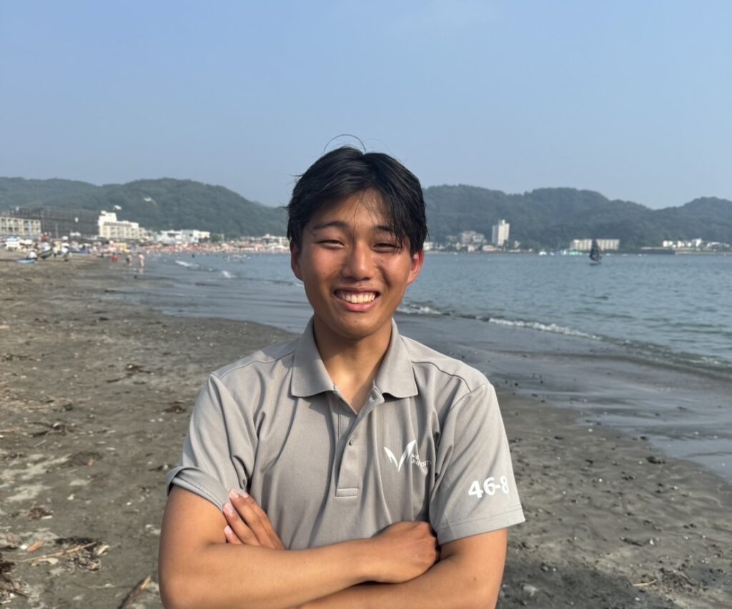 毎年夏になると僕はボートやジェットに乗って遊んでいました。その中で、モーターを使って走っている自分たちに自然の力だけで並走してくるウィンドサーフィンに興味を持ちました。初めての新歓練習の時、うまく下ることができず、先輩たちに助けてもらいました。その経験がとても悔しく、自分の力で思い通りに乗れるようになりたいと思いこの部活に入部することとなりました。