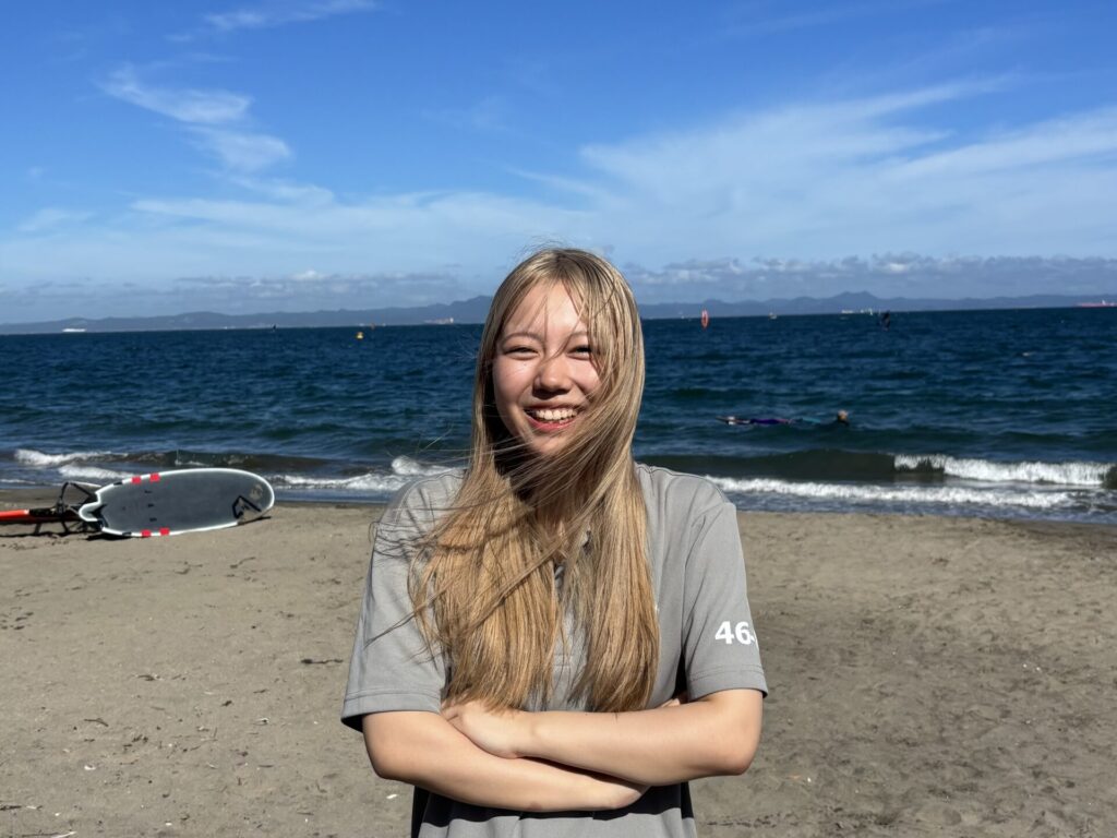 私は、大学に入学するまで「ウィンドサーフィン」という競技があることを知りませんでした。4月の新歓でたくさんのチラシをもらい、整理していた時に、たまたまボードセーリング部のチラシが目に留まりました。興味を持ってInstagramをのぞいたのが最初のきっかけです。そこからInstagramを見たり先輩方のブログを読んだりしていくうちに、だんだんとウィンドサーフィンに惹かれていきました。他にも、大学生という節目で「新しいことに挑戦したい」と思っていたこと、そしてもともと海が好きだったこともあり、マネージャーの試乗会に参加することを決めました。残念ながら天候の影響で船に乗ることはできなかったのですが、赤灯から見たウィンドサーフィンの姿がとてもかっこよくて、目標に向かって一生懸命頑張る先輩方の姿を見てお話を聞いて、「私もこの場所で頑張りたい」と強く思い、入部を決めました。